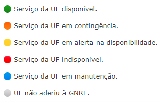 Este link acessa a página para consulta da disponibilidade do serviço das UFs no Portal da GNRE. Nela é exibida a situação de cada UF, de acordo com a legenda abaixo: