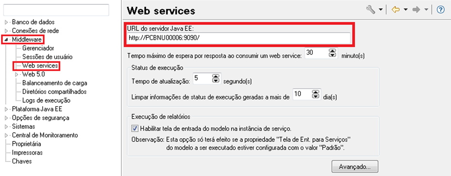 Execute o SeniorConfigCenter e acesse o ambiente desejado. Selecione o menu Middleware > Web services e copie a URL definida no campo URL do servidor Java EE, conforme indicado na imagem abaixo: