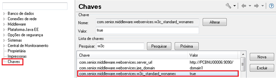 No SeniorConfigCenter, acesse a opção Chaves no menu. Serão exibidas todas as chaves de parametrização presentes para o ambiente que está sendo verificado. Nesta tela, poderá ser efetuada a busca digitando a palavra w3c no campo Pesquisar e clicando no botão Pesquisar. Será encontrada a chave com.senior.middleware.webservices.w3c_standard_wsnames, conforme exemplo na imagem abaixo.