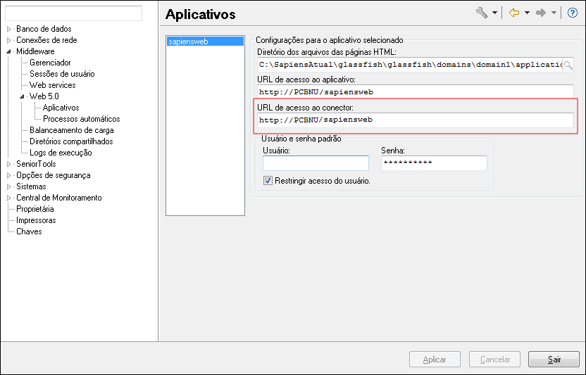 2. Informe a URL de conexão com SeniorSID e as credenciais do usuário a ser utilizado;
