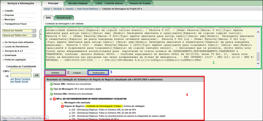 Em diversas situações, é necessário efetuar a validação do arquivo XML gerado pelo ERP para cada documento eletrônico, a fim de verificar se realmente o mesmo possui alguma inconsistência, de acordo com as validações efetuadas pela SEFAZ. Para isso, a SEFAZ-RS disponibiliza um validador on-line para os documentos eletrônicos NF-e, CT-e e MDF-e (as validações de arquivos XML de eventos de cada documento eletrônico também são efetuadas).