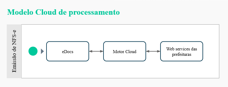 Este modelo é um formato de integração em que o motor de processamento das NFS-es fica na Cloud Senior, sendo válido para emissão de NFS-e. Quando o eDocs recebe o .XML de um documento de um fornecedor homologado, ele envia o .XML para o motor na Cloud, que faz todas as tratativas necessárias — como a conversão para o leiaute da prefeitura e a comunicação com os web services municipais — e retorna o resultado ao eDocs.