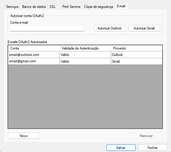 A grade E-mails Oauth2 Autorizados lista as contas cadastradas no configurador, indicando o provedor associado a cada uma (Outlook ou Gmail). A coluna Validade da Autenticação informa se o token atual está válido ou expirado junto ao provedor. Tokens expirados podem afetar o funcionamento normal dos serviços relacionados à conta de e-mail. Eles podem ser removidos usando o botão Remover ou renovados por meio dos botões correspondentes ao provedor específico.