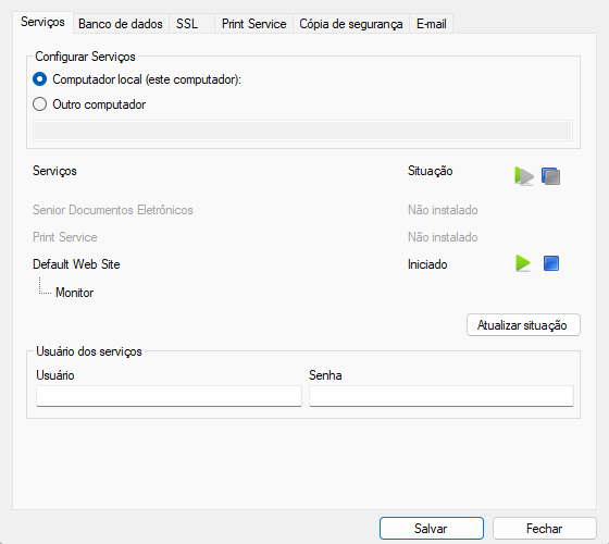 Informar Usuárioe SenhaAdministrador que tenha permissão para iniciar\reiniciar os serviços. Para que a alteração de usuário e senha seja atualizada, o Configurador deve ser executado como administrador (botão direito sobre o arquivo executável e Executar como administrador).