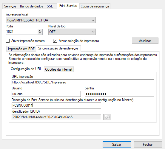 Identificador textual para diferenciar o servidor de impressão. No Monitor serão listados os servidores que realizaram registro nos últimos 30 dias. Para agilizar o processo de identificação dos servidores durante o processo de configuração de impressão, é possível sugerir um nome para o Print Service. Se deixar esse campo em branco o sistema utilizará o nome do computador como identificação textual.