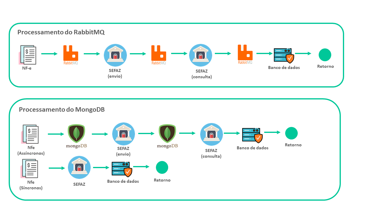 Com a implementação do MongoDB no eDocs, as integrações síncronas de NF-e são realizadas diretamente com os serviços da SEFAZ sem a necessidade de passarem pela aplicação do MongoDB. Nas versões anteriores do sistema as integrações síncronas e assíncronas passavam pelo RabbitMQ durante o processo. Abaixo, segue uma demonstração da diferença entre o processamento com o RabbitMQ e o MongoDB.