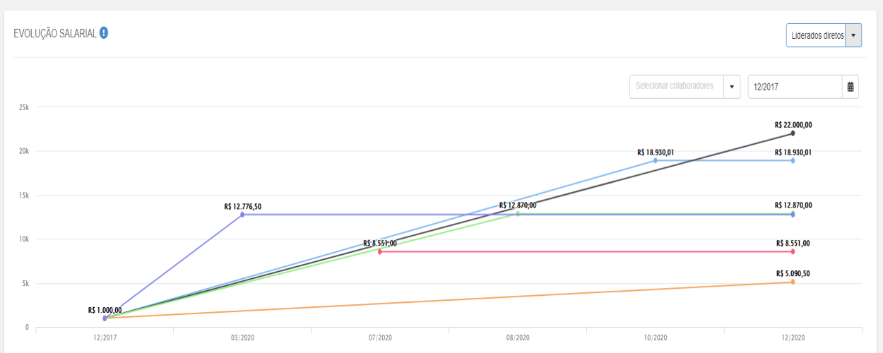 This chart displays the salary average of led people (all or directly-led), serving as a basis for values offered in salary adjusts or raises (spontaneous and legal) or admission of workers. By analyzing the chart, you can check whether a value is in, above or below the salary average of the team.
