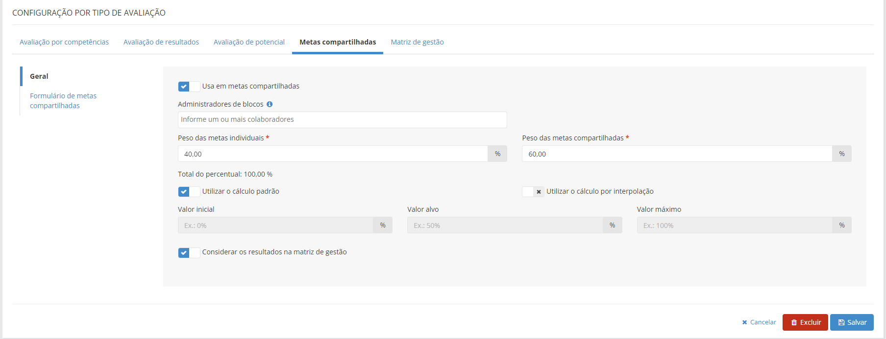 Se você pretende lançar metas compartilhadas nas avaliações dos colaboradores, você precisa configurar quais opções estarão disponíveis para esse tipo de meta.