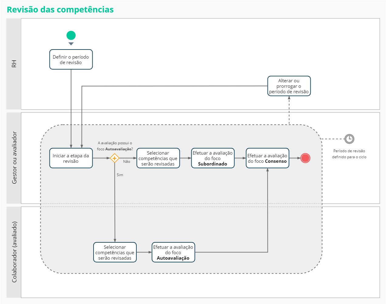 No período definido, o botão Revisar competências fica disponível para o Gestor/Avaliador nos focos subordinado, consenso e autoavaliação. Quando esse recurso é usado, a avaliação retorna para a etapa de seleção das competências e fica com a situação Em andamento.