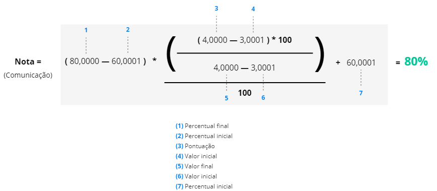 Os valores que compõem a fórmula têm origem no cadastro da escala de proficiência (Gestão de desempenho > Cadastros > Escalas de proficiência).