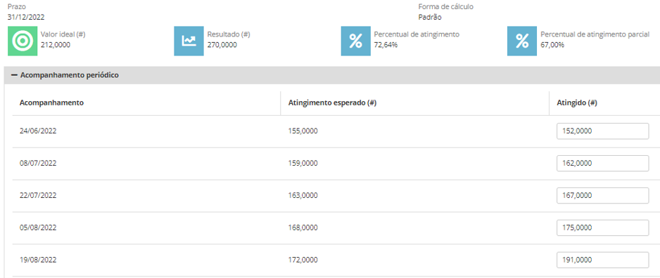 Ao alterar os acompanhamentos periódicos, o cálculo do percentual de atingimento parcial é sempre realizado. Para isso, o cálculo considera os percentuais de atingimento informados e o atingimento esperado para esses acompanhamentos.