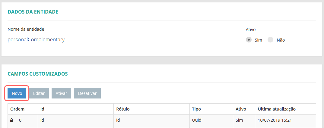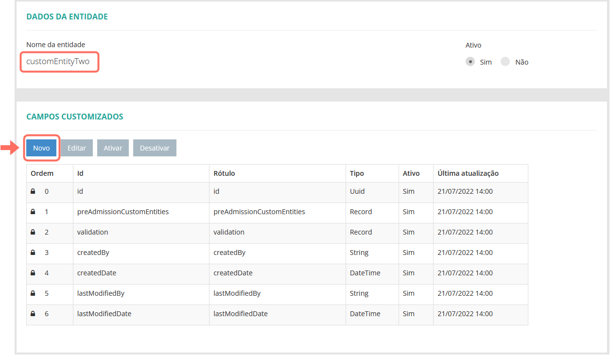 When you access an entity's screen, you may notice that it already has some fields. These are standard system fields, which are protected from any kind of editing and are identified by a padlock