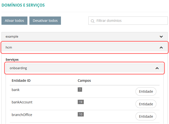 4. In the hcm domain, look for the onboarding service. With this service you can manage the Colabbe system's customized fields, grouped by entity. Entities represent groups of information, such as company, bankAccount, among others.