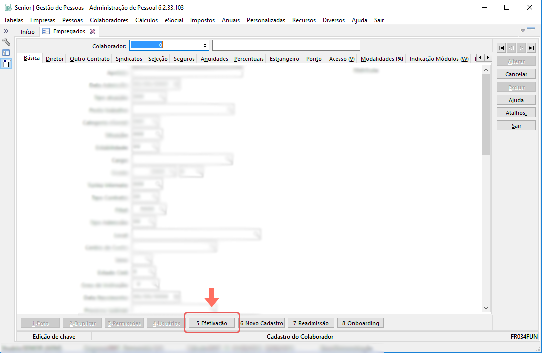 In the Personnel Administration module, access the Employees' Basic File, at: Employees > Registration Form > Employees (FR034FUN).