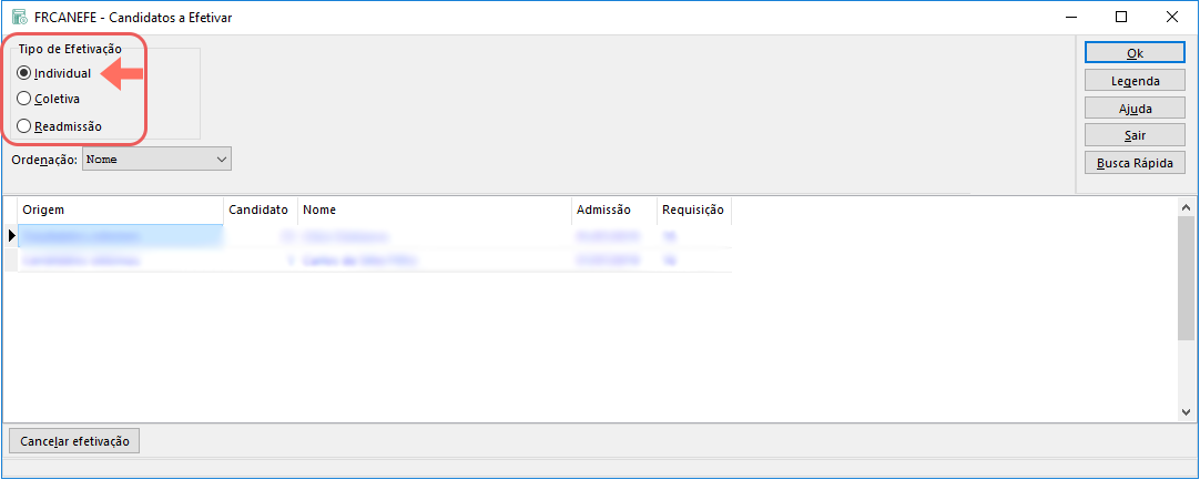 The Candidates to be hired screen will be displayed (FRCANEFE).