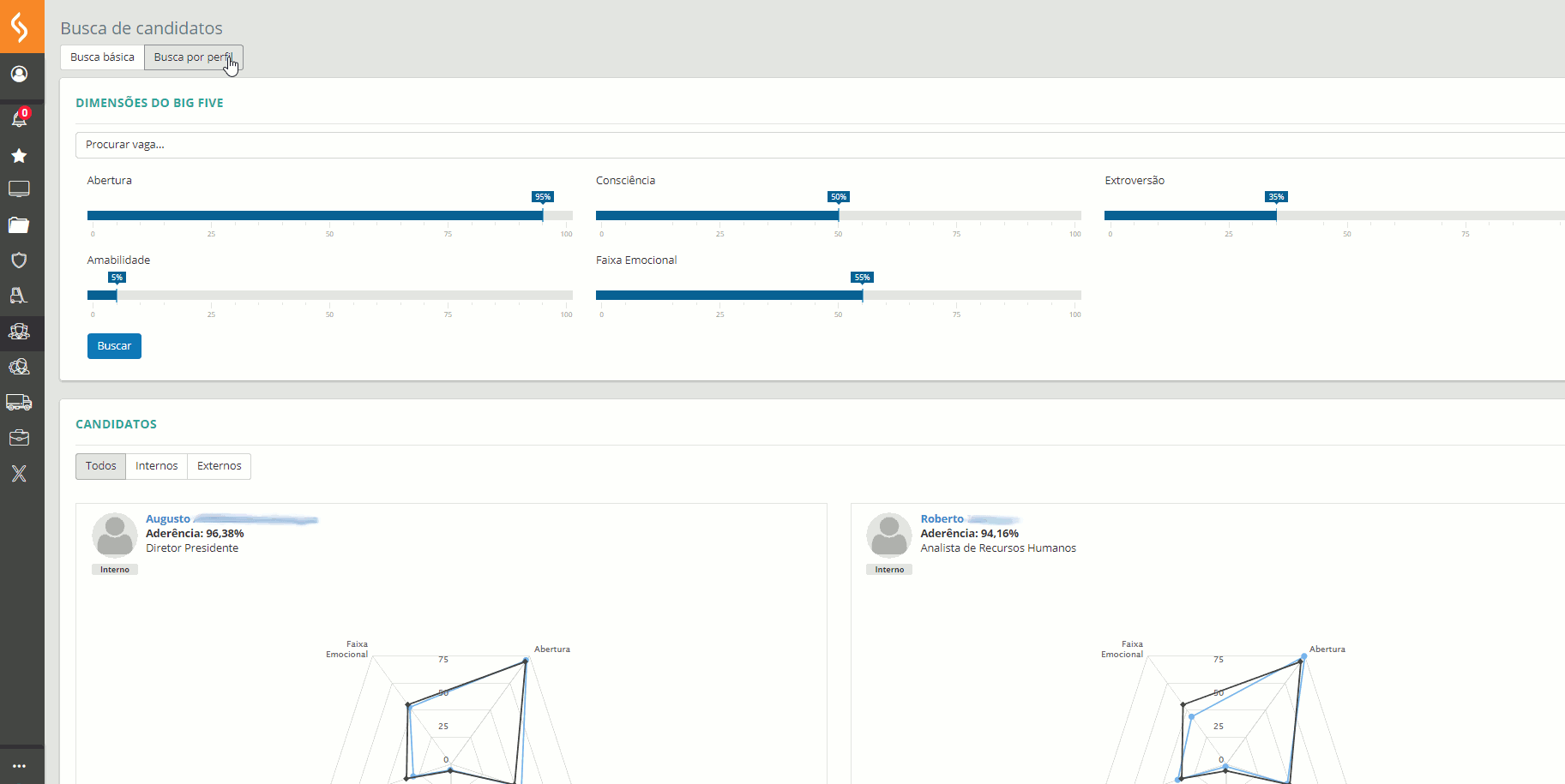 After the candidates attend the interview, the recruiter has the possibility of comparing the profile of different candidates in relation to the job opening and their compliance to it in: Recruitment management > Candidate search > Profile search. Candidates are ordered by the compliance calculation, which is a simple average of the obtained/expected percentage in each dimension. In this calculation, surpassing in a category does not generate a "bonus", as this surpassing must be analyzed by the recruiter. In some cases, this may be a positive thing and in others, a negative thing.