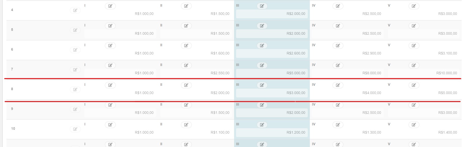 - Option:Only when the new salary entered is identical to that registered in one of the salary ranges that is, it will display the salary range only if the added value is identical to the range value informed in the table. If the value is different, even for one cent, the range will not be displayed.