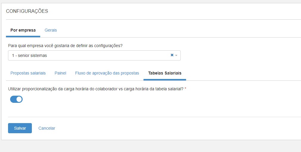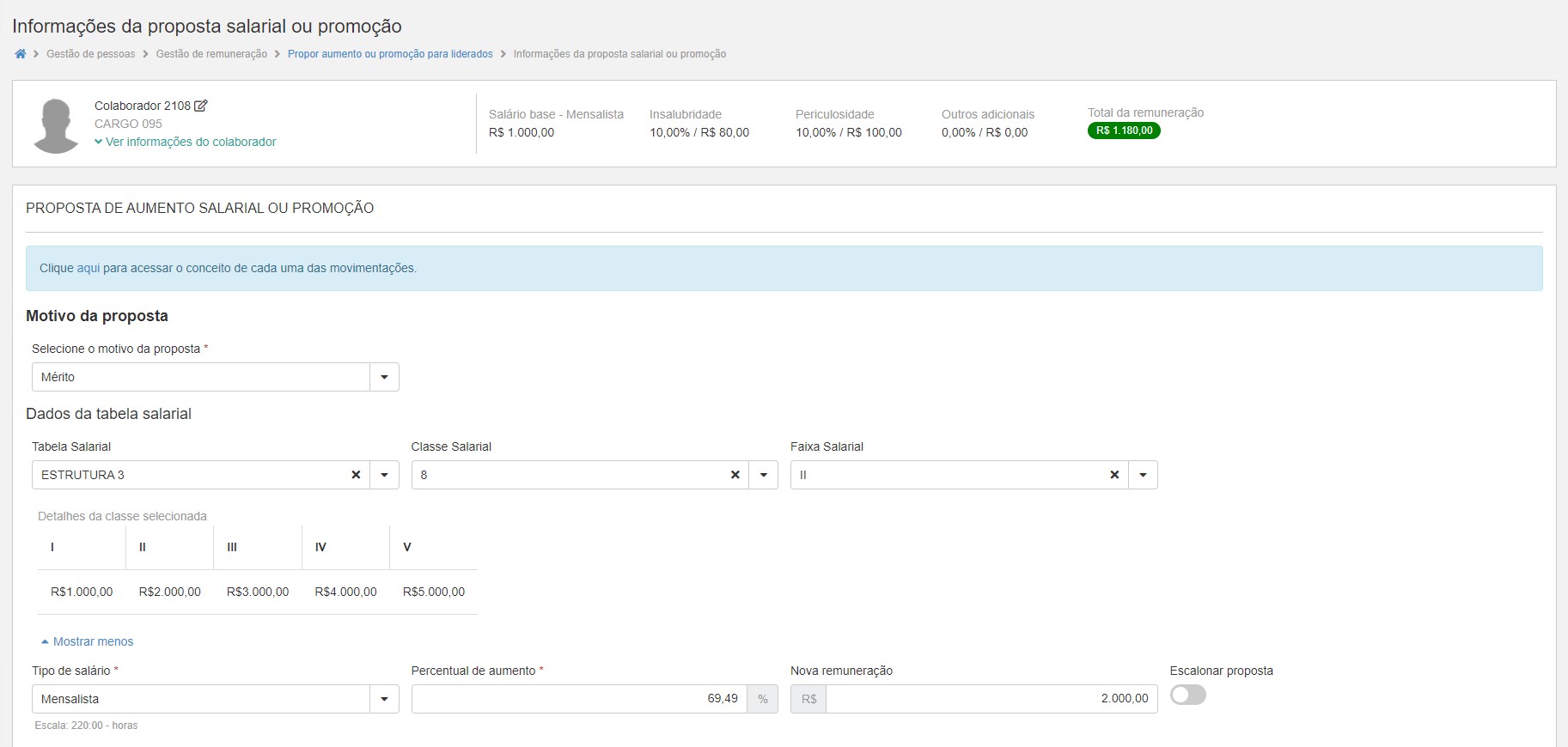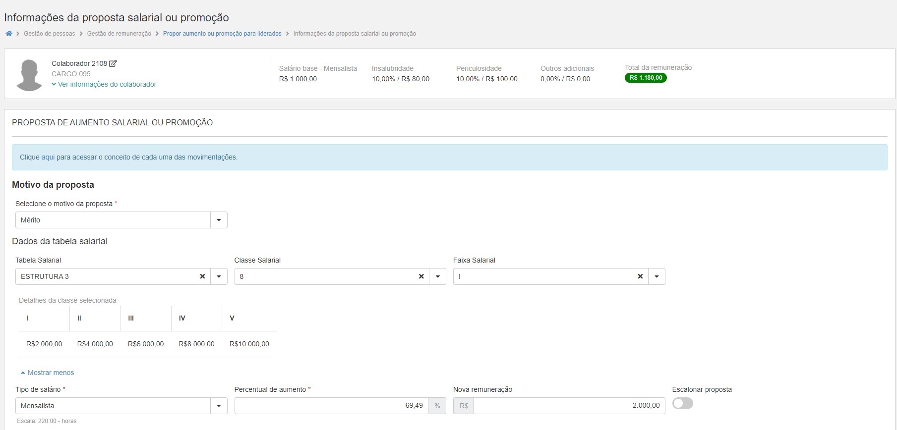For example: If the employee's current salary is R$ 1,000.00 and the workload he works is 220 hours, without proportionalization, the proposal screen shows the table with the same amounts registered in it and suggests the Level II in the amount of BRL 2,000.00 for the employee's proposal. Now if we activate the configuration, and return to the same proposal, we can see that the employee's current salary is R$ 1,000.00 and the workload he works is 220 h, however, now with the proportionalization configuration activated, the proposal screen shows the table with the proportional values between the value of the employee's workload X the workload of the salary table. In the example, the workload in the table is 110 hours, which is half the value of the hours worked by the employee, so the table here is proportional to double the amount, so the proposal page now suggests Level I in the amount of R $2,000.00 for the contributor.