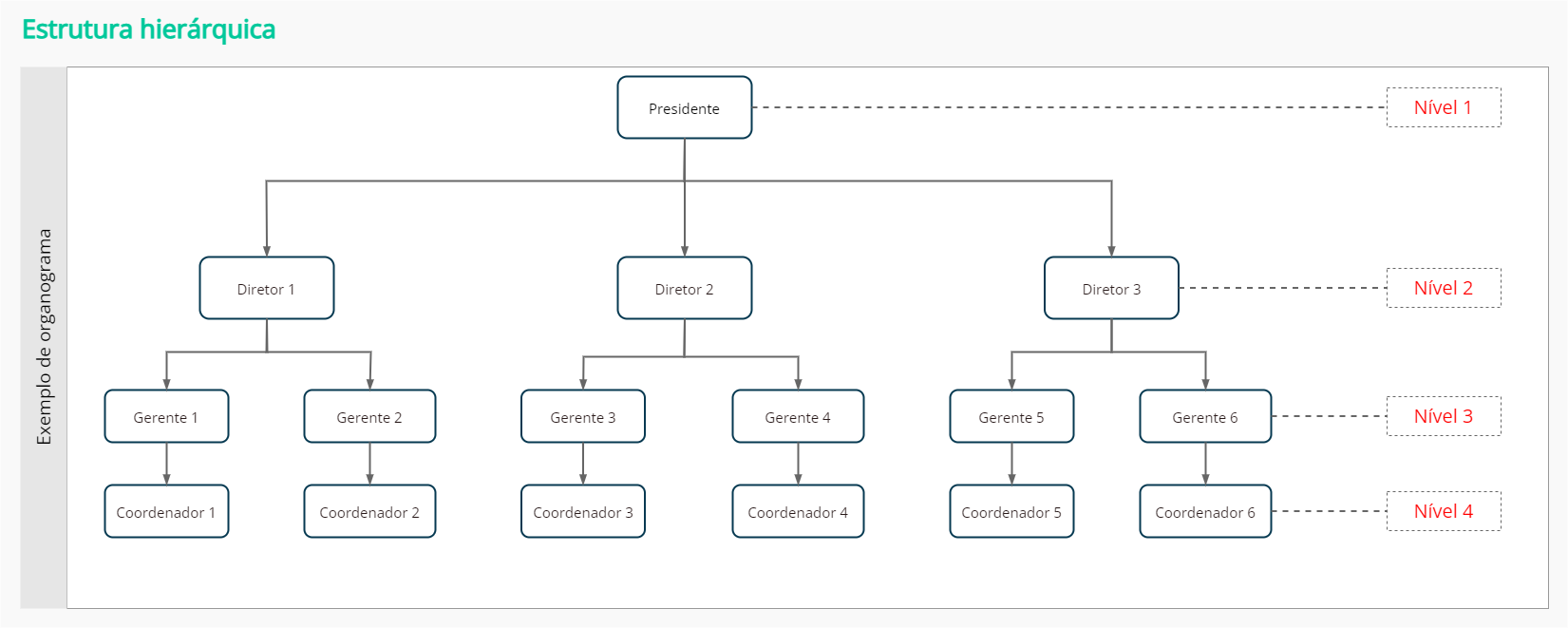 A imagem abaixo apresenta, como exemplo, uma organização que possui na sua estrutura hierárquica 4 níveis de gestão: