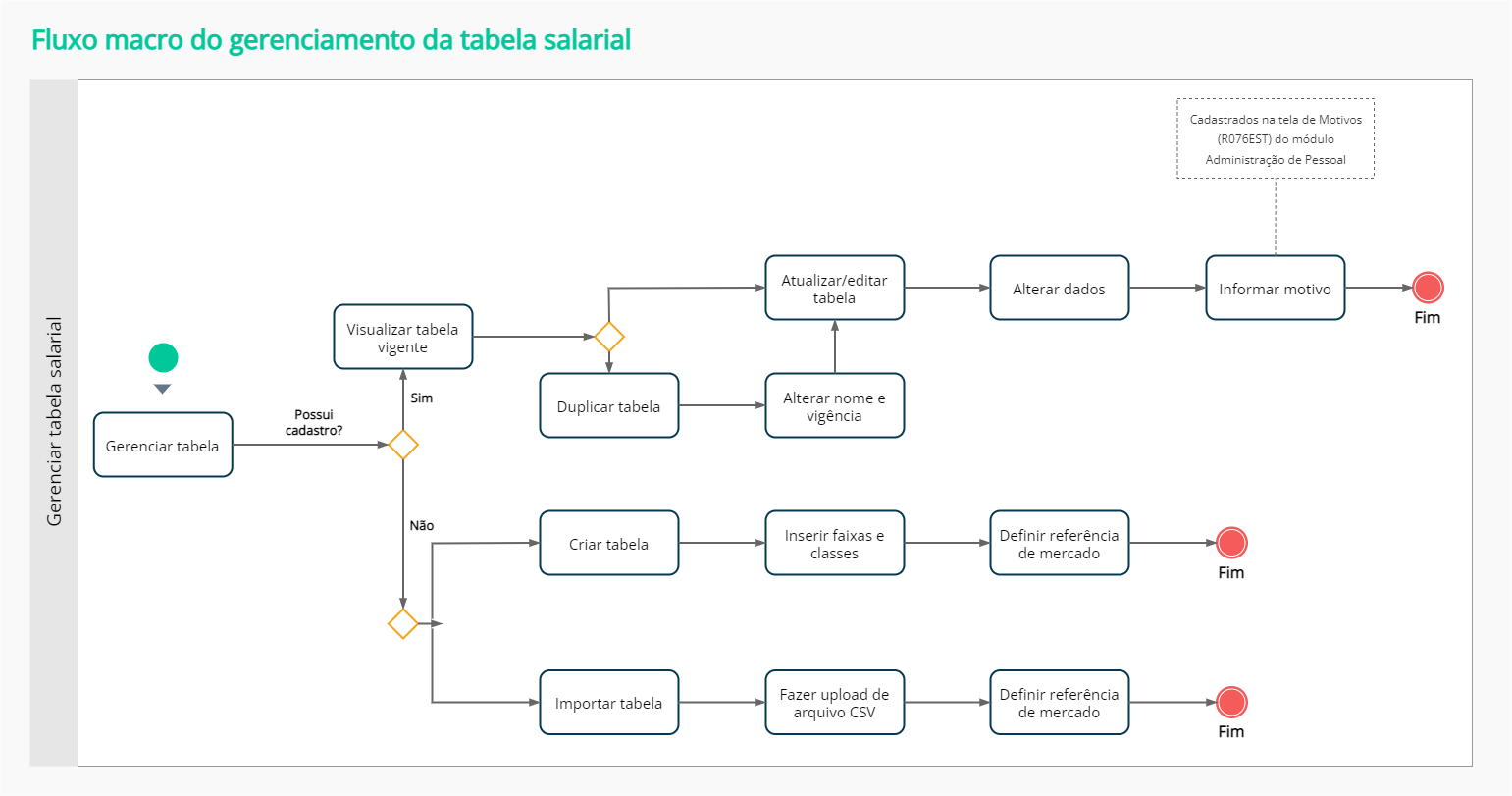 It is possible to register a salary table manually, that is, inform value by value of each class and range of the salary table using the buttoncreate table, under Compensation management > Salary table.