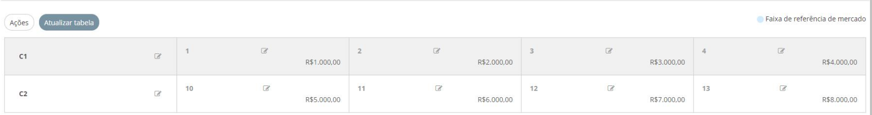 - Register market reference values in a table separate from the salary table: when selecting this option, a column will be created on the left side of the salary table, entitledMarket reference values, in which HR can register values for the corresponding levels and ranges.
