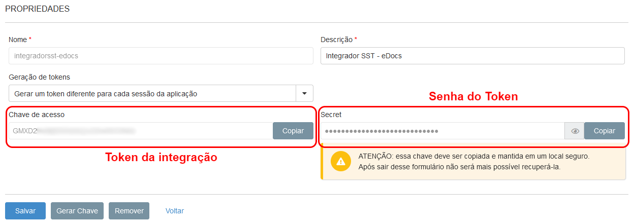 Importante Qualquer alteração feita nas chaves de acesso da aplicação impacta diretamente nos próximos passos da implantação. Caso você altere essas configurações, precisará rever o item Configurar a conexão do eDocs com a plataforma senior X, mais adiante neste checklist. Para saber mais, consulte também a seguinte documentação: