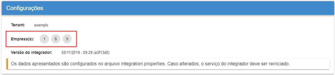 No dashboard são apresentados os códigos das empresas que são integradas atualmente:
