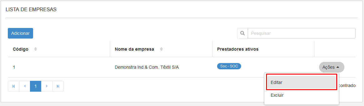 - Na lista de empresas disponíveis (ou depois de ter cadastrado uma nova empresa), clique em Ações ao lado do registro da empresa para onde quer fazer a carga dos dados e selecione Editar.
