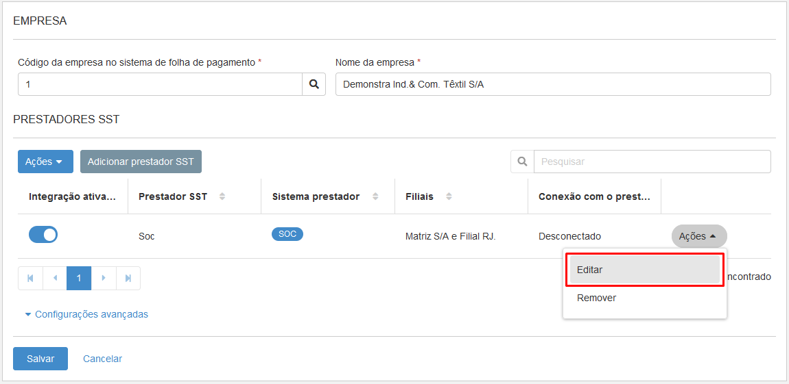 - Depois de ativar a integração das filiais, ative também a integração do prestador e clique em Salvar.