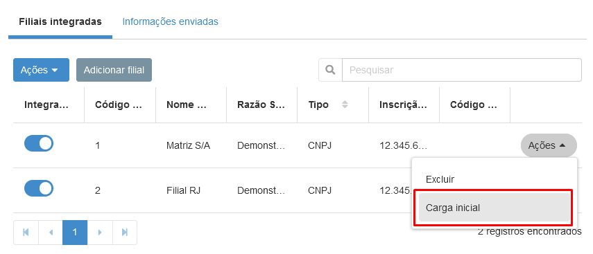 - Finalmente, clique em Ações ao lado da filial para onde quer fazer a carga e selecione a opção Carga inicial: