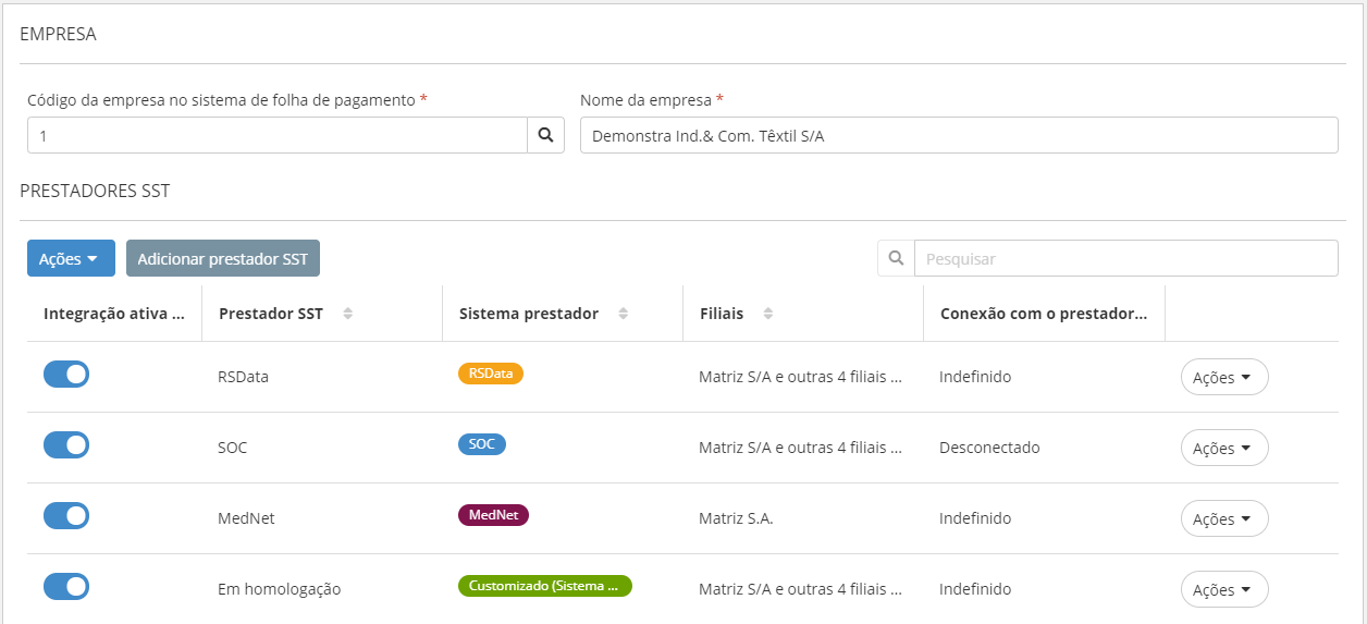 - Se todas as filiais usam o mesmo prestador SST, inclua todas as filiais nesta configuração.