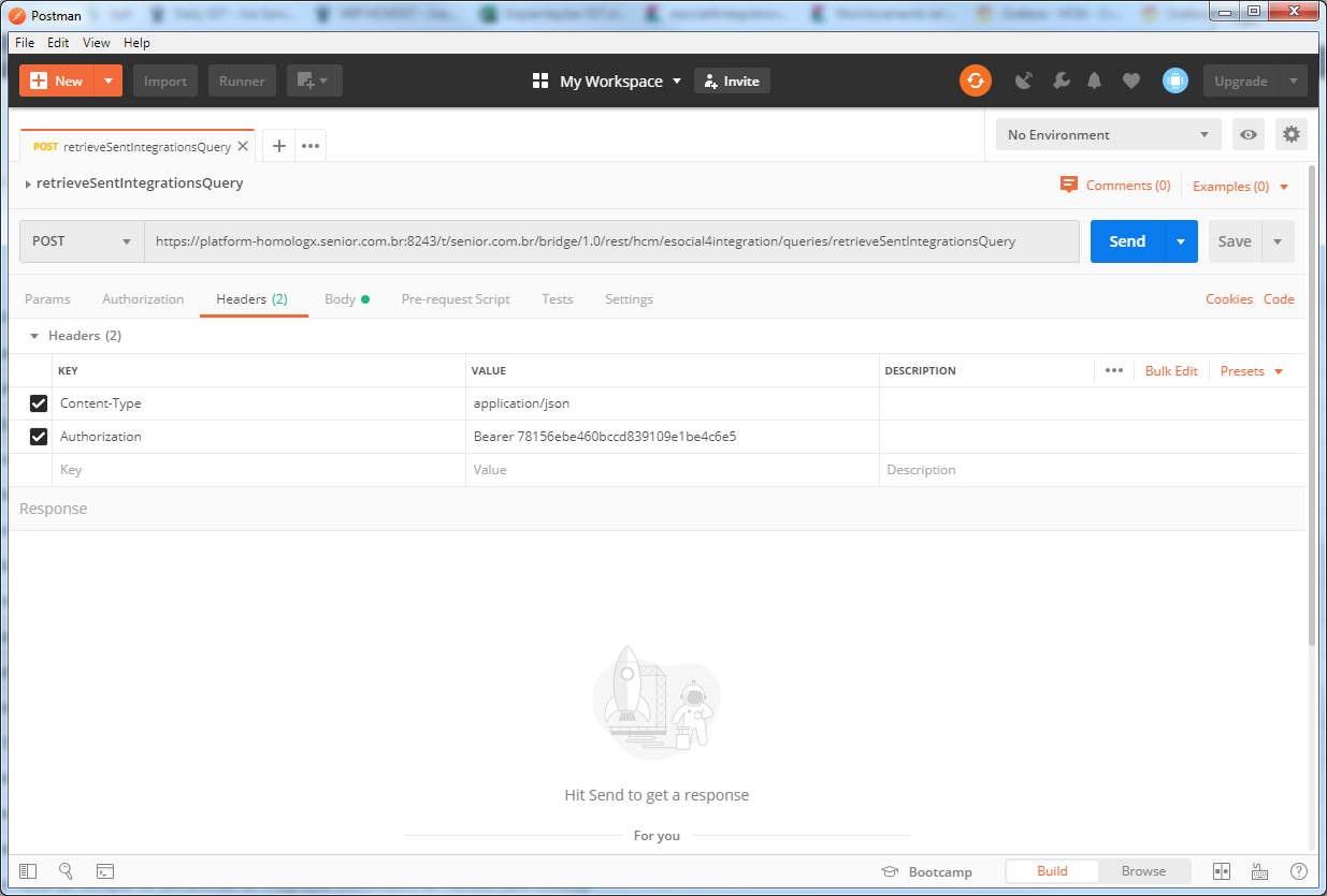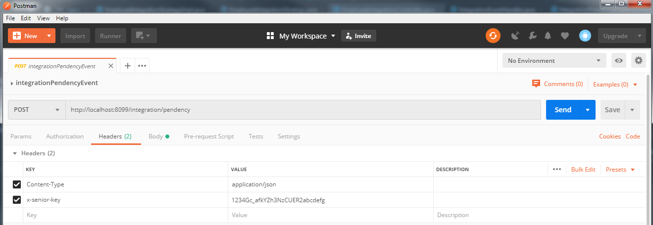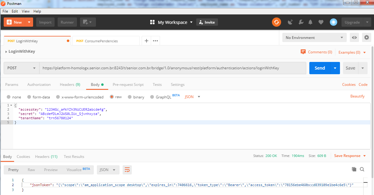 "accessKey": "XXX","secret": "XXX","tenantName": "XXX"}Passo 2 - Buscar as pendências de integração da plataforma da Senior