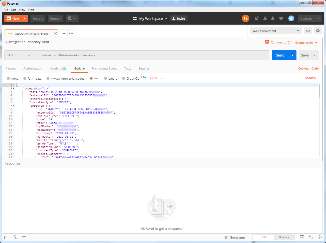 A pendência de integração é enviada pela plataforma da Senior com os parâmetros abaixo: