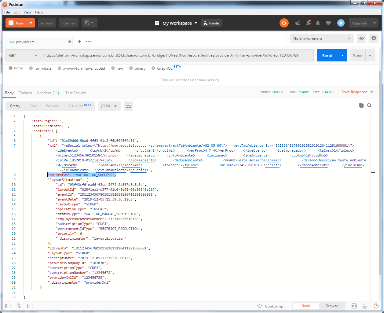 { "result": { "id": "a7b1df6c-2d8d-4770-9191-1fa6558a306e", "xml": "XML do leiaute do eSocial", "xmlStatus": "VALIDATION_SUCCESS", "providerStatusType": "ON_PROVIDER", "layoutSituation": { "id": "306c4c5e-8376-4ba4-bf25-6a78a0b77733", "layoutId": "01a7355c-e661-4198-8653-511c3d723243", "eventId": "ID1248926420001002019061707564900000", "eventDate": "2019-01-01T00:00:00Z", "layoutType": "S1060", "layoutSourceType": "TYPED", "operationType": "INSERT", "statusType": "WAITING_GOVERNMENT_RETURN", "layoutMessage": null, "receiptNumber": null, "registrationNumber": null, "employerDocumentNumber": "39659157000169", "employeeDocumentNumber": "68334152345", "subscriptionType": "CNPJ", "environmentIdType": "PRODUCTION", "priority": 1 }, "stackTrace": null, "message": null, "idEvento": "ID1248926420001002019061707564900000", "layoutType": "S1060", "receiptDate": "2019-01-01T00:00:00Z", "providerCompanyId": "123456", "subscriptionType": "CNPJ", "subscriptionNumber": "39659157000169", "providerXmlId": "999", "providerErrorMessage": null } } |