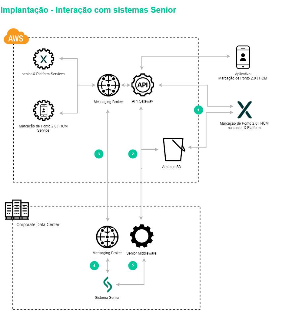 2. The integration of the necessary information for the Clocking Event 2.0 is done through the public APIs and the Senior Middleware. In this way, the platform addresses must be accessible in the client's infrastructure.