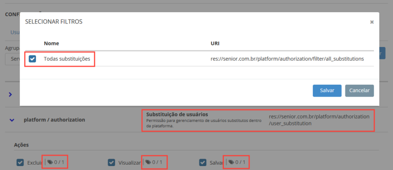 • Substituição de usuários (/platform/authorization/user_substitution) — permissão para gerenciamento de usuários substitutos dentro da plataforma. Selecione todas as ações disponíveis (Excluir, Visualizar e Salvar).