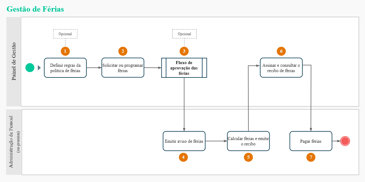 Algumas etapas do processo de gestão de férias são executadas diretamente pelo Painel de Gestão, enquanto outras são feitas pelo módulo de Administração de Pessoal (on-premise), conforme o fluxo abaixo.