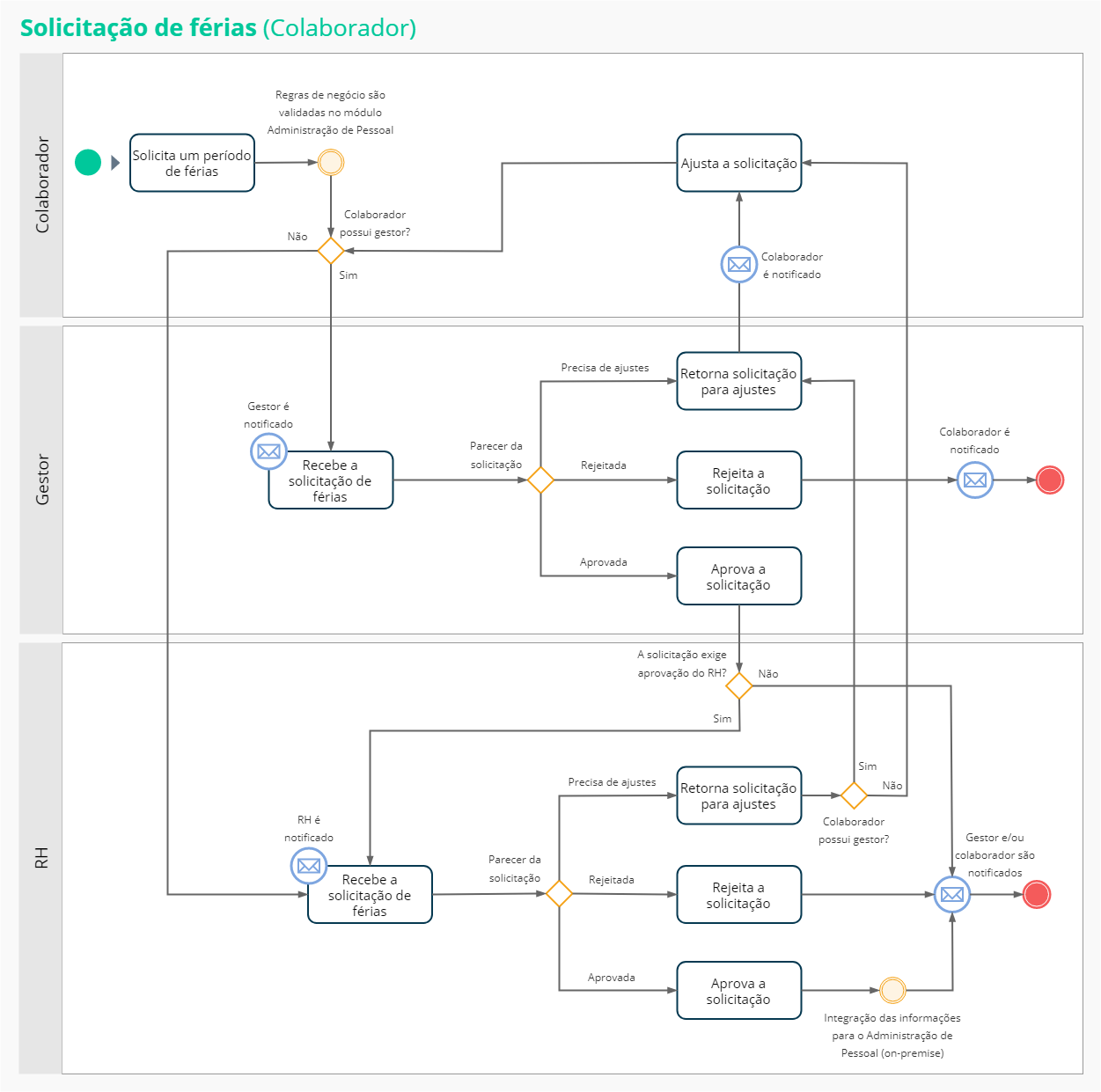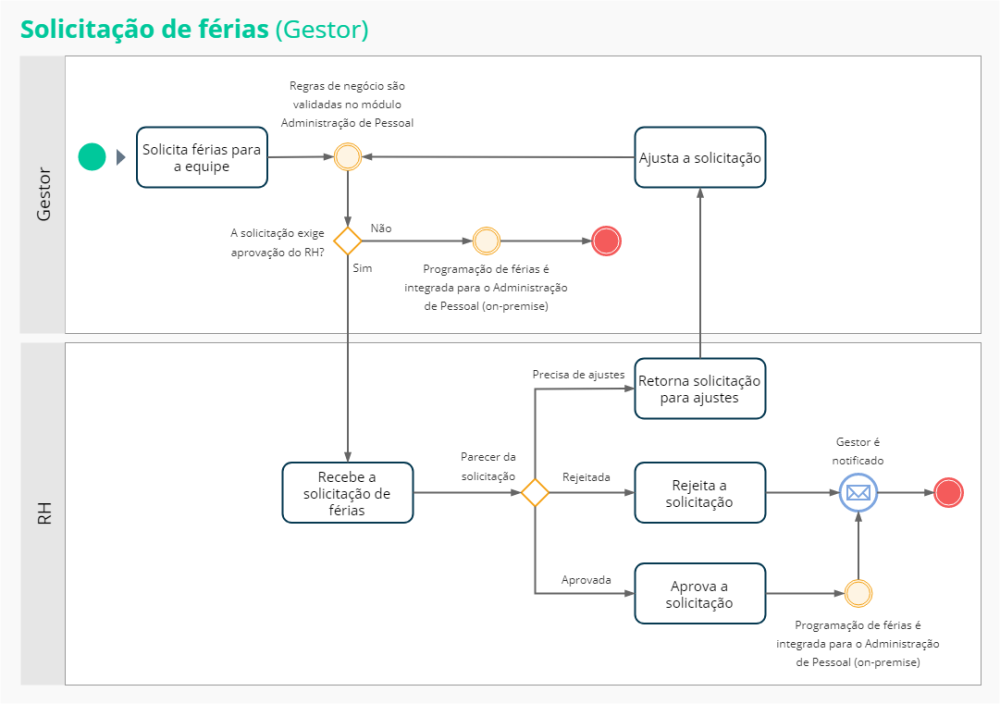 A solicitação de férias passa por um fluxo de aprovação entre o gestor e o RH, caso a empresa tenha definido dessa maneira.