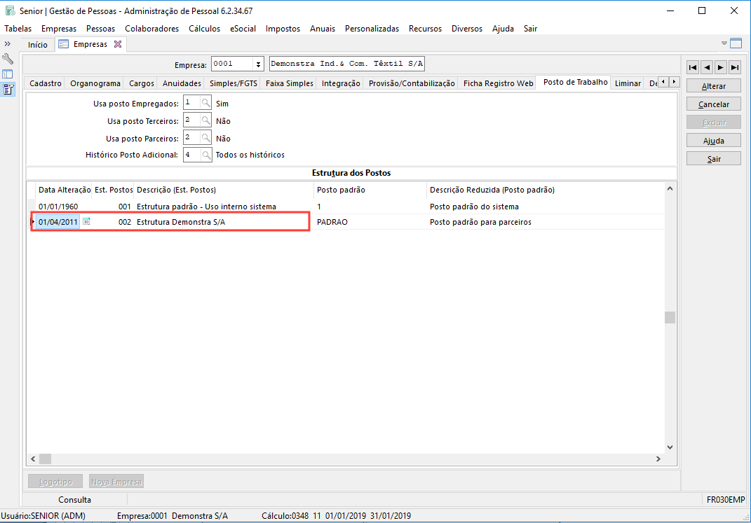 Para verificar se a empresa possui uma estrutura de postos de trabalho implantada, acesse o cadastro da empresa em: Empresas > Empresas, guia Posto de Trabalho.