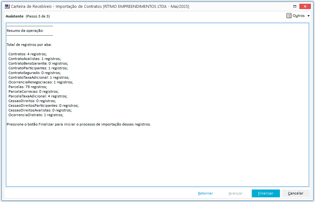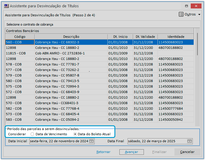 - Total selecionado distribuição: total do valor selecionado na etapa de seleção de contratos para associação de parcelas.