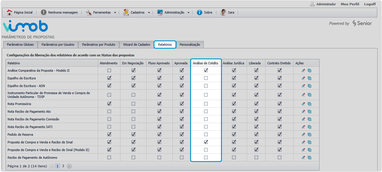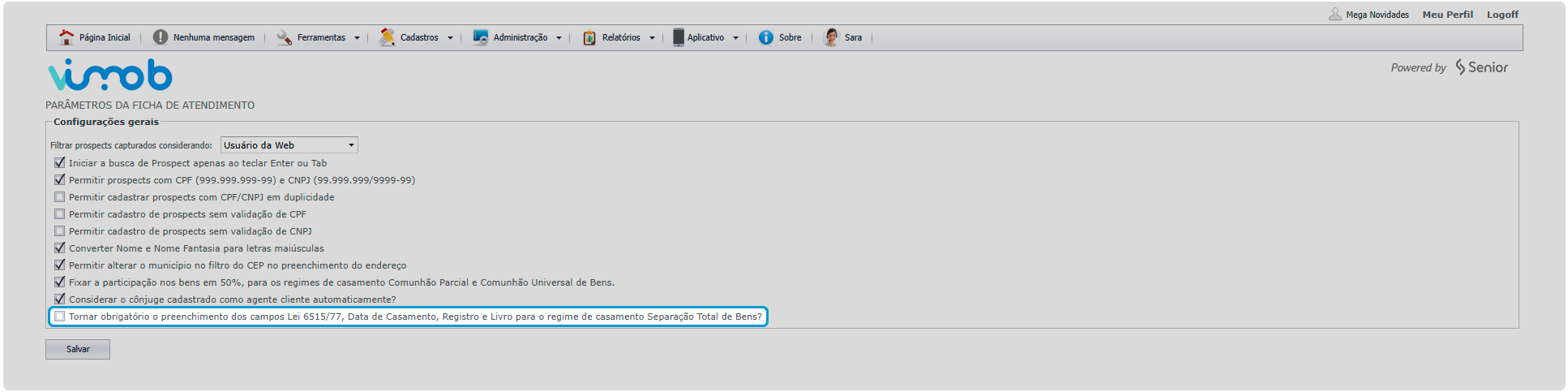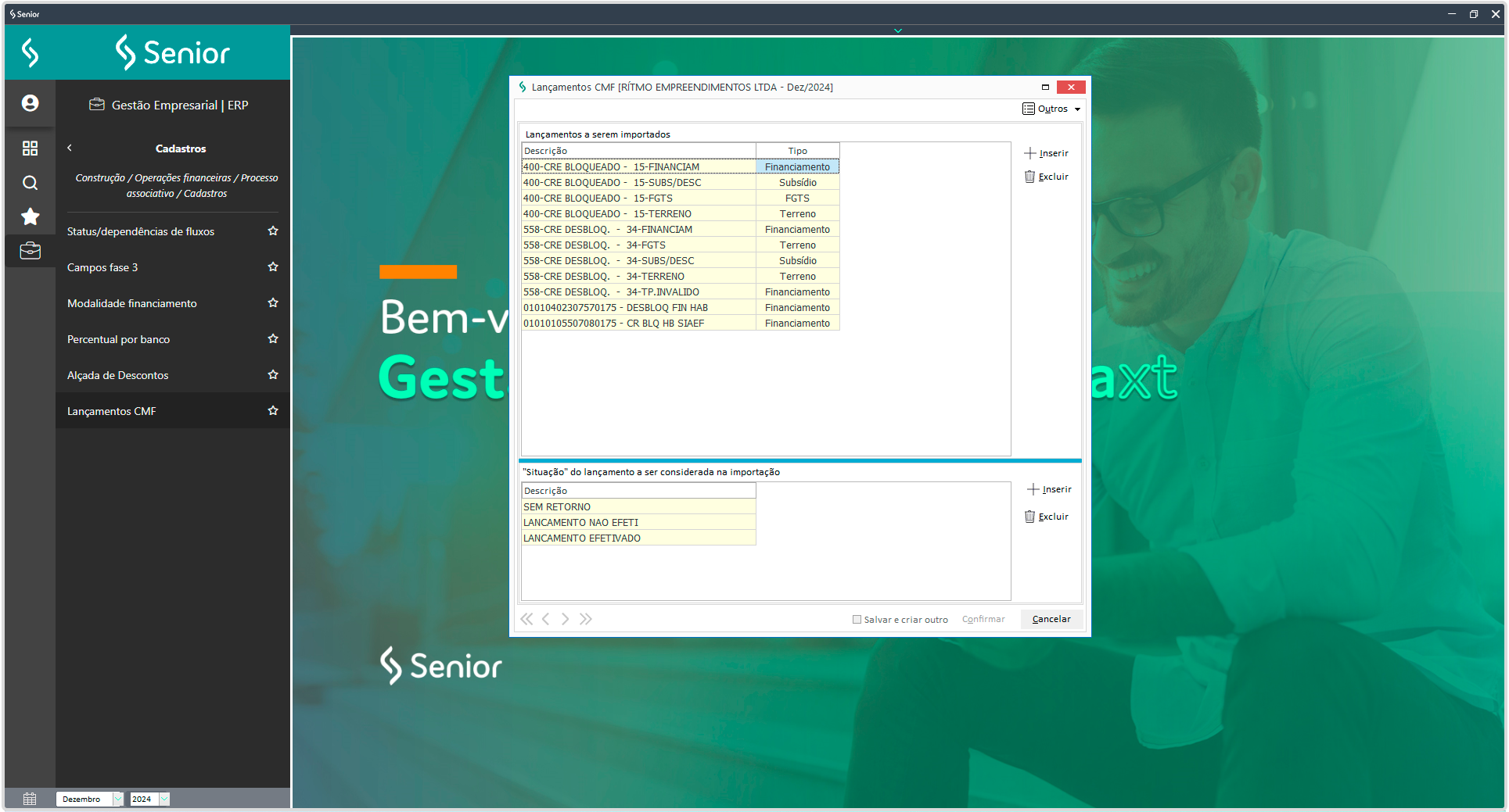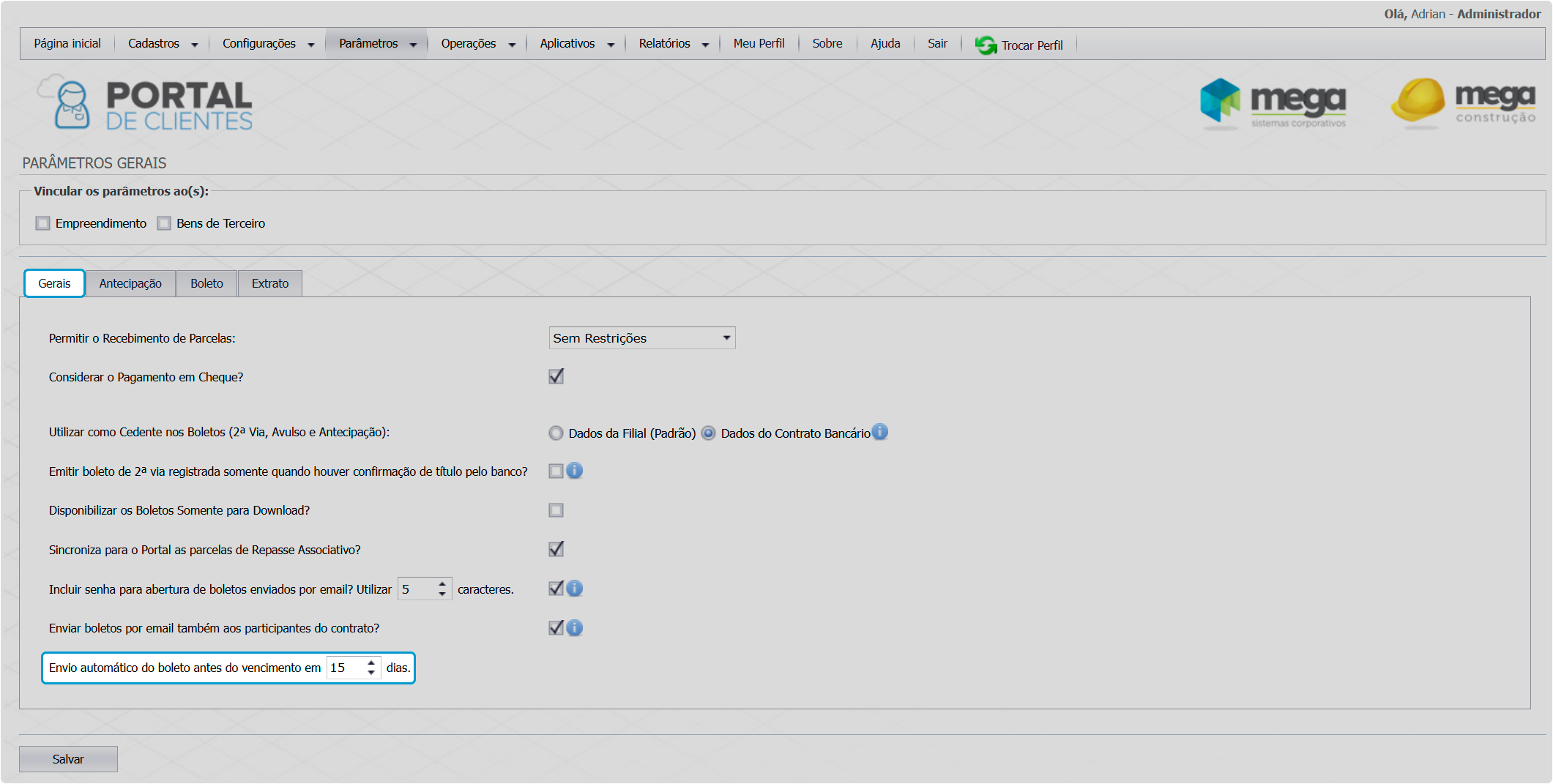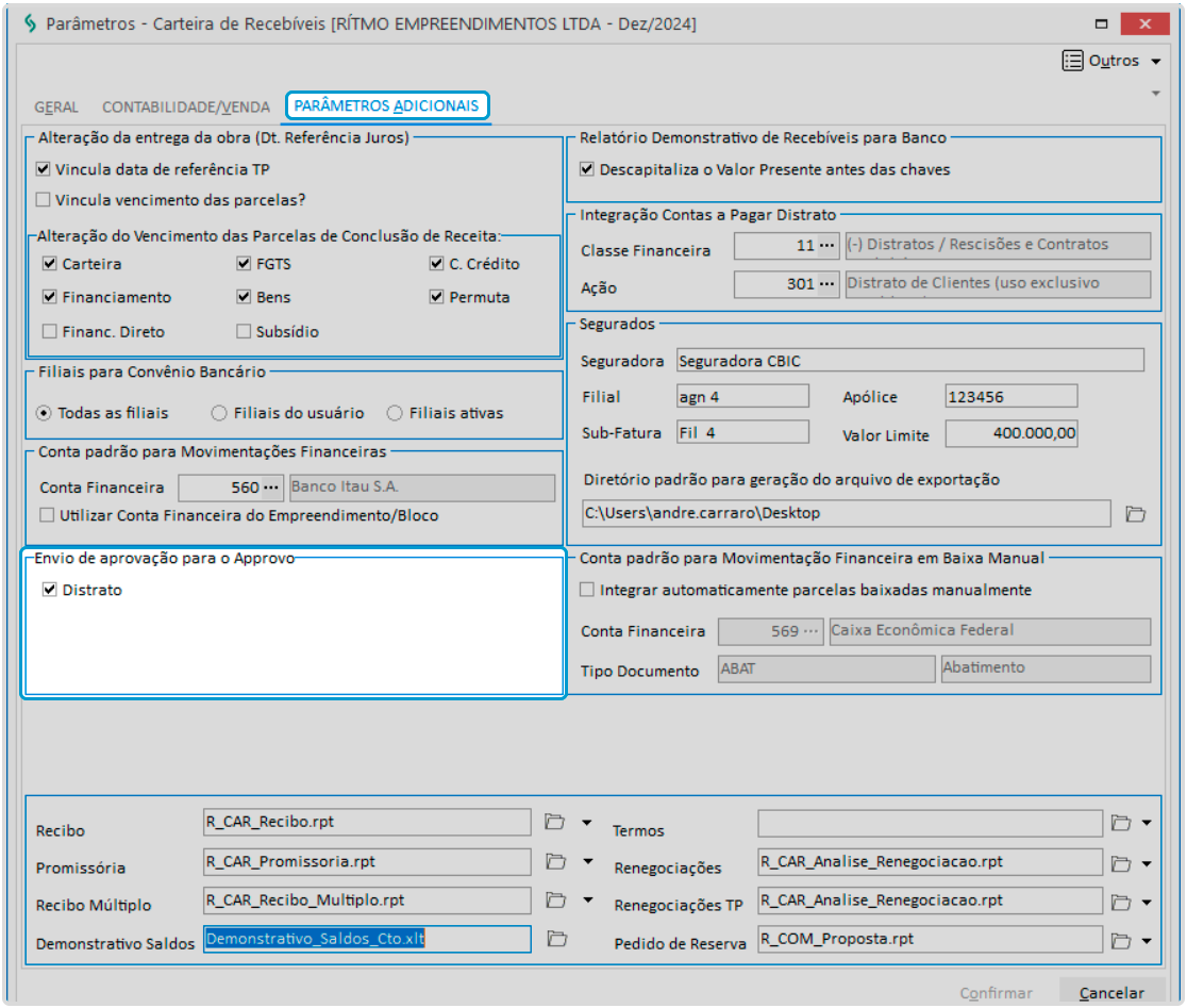 Local: ERP Senior Mega > Construção > Carteira de Recebíveis > Configurações > Parâmetros.