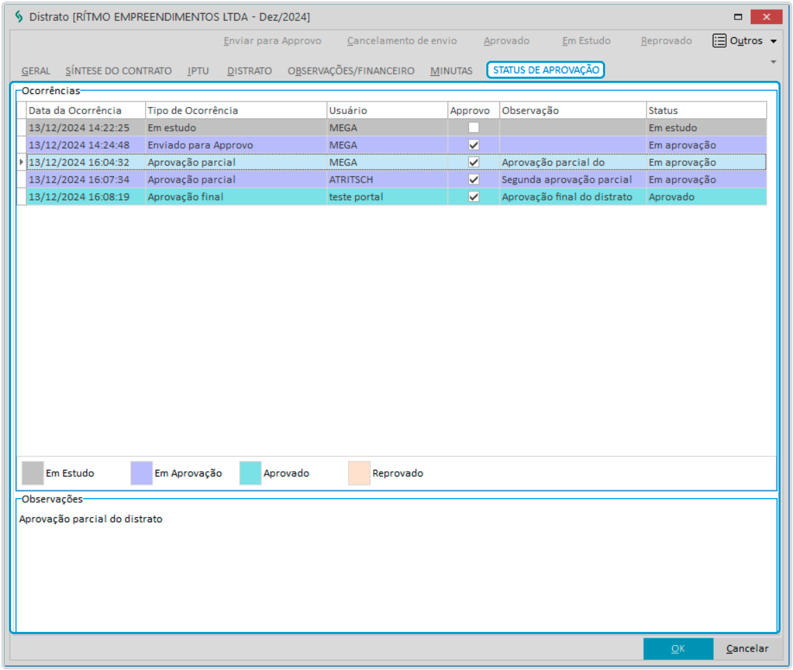 Visibilidade: a nova tela chamada “Status Aprovação” permite acompanhar o andamento das solicitações enviadas, incluindo informações como data da solicitação, usuário solicitante, status do envio ao Approvo e eventuais observações.