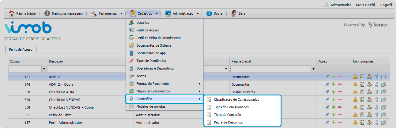 Local: ERP Senior Mega > Construção > Gestão Comercial > Comissões > Comissões.