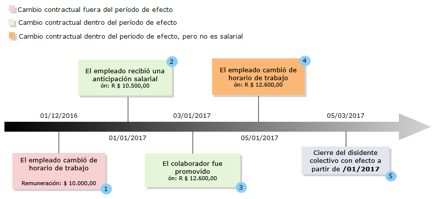 Luego de los envíos normales del S-2206 (derivados de los cambios contractuales en los puntos 1 a 4), el 03/05/2017, se tomó la decisión que condujo al cierre de la convención colectiva (punto 5). En esta fecha se debe enviar un expediente para complementar los ítems anteriores (3, ya que los ítems 1 y 2 están fuera de vigencia y el ítem 4 no se refiere a cambio de salario).
