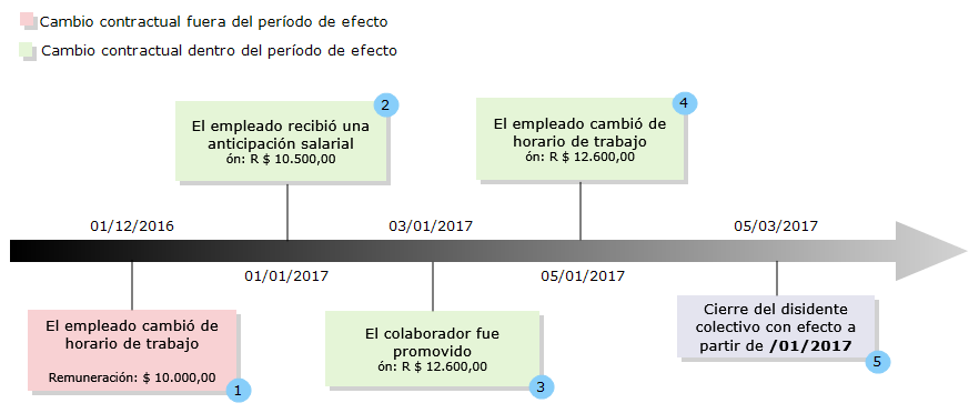 Ejemplifica un escenario en el que el empleado pasó por algunos cambios contractuales que resultaron en la presentación del diseño S-2206. Debido a un convenio colectivo con efecto retroactivo (desde el 01/01/2017), será necesario realizar nuevos envíos para ajustar la información anterior.