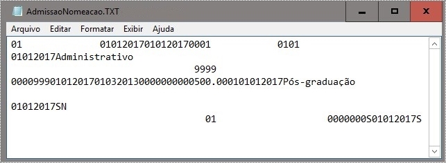 | Datos Funcionales del Agente Público Activo (FR303DAD) | Representa el registro de ocurrencias de inclusión, alteración o terminación del bono del agente público activo, es decir, de cada persona en la nómina de la agencia, según los tipos de especificación de los bonos en la tabla "78 - Especificación del Bono del Agente Público" . De esta forma, se dejará constancia de cada cambio en la situación funcional del agente público. | R303DAD | Funcional DataAgentPublicActive.txt | |