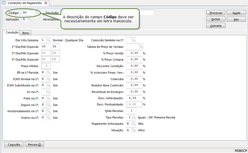 Registrarse condición de pago que código es "AV", pues los proveedores serán enviados con esa identificación y ella ya necesita ser conocida del ERP: