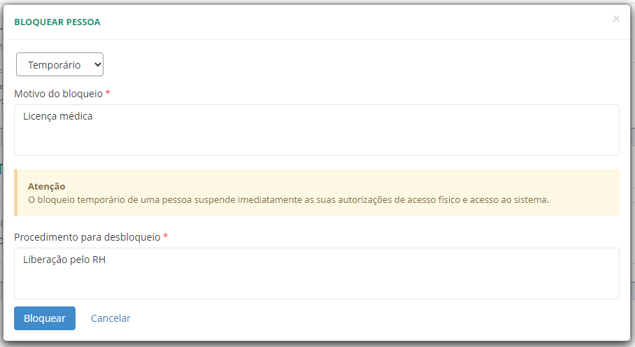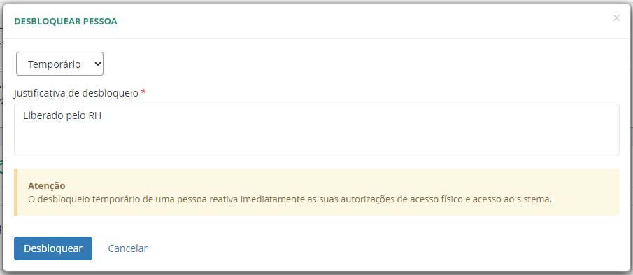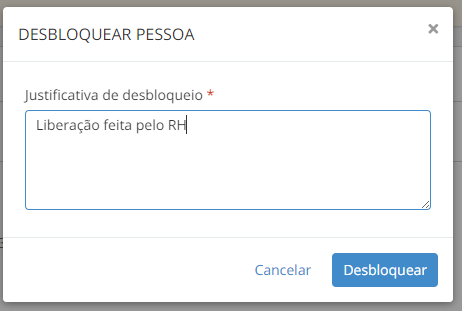 Para restaurar esas autorizaciones de acceso y hacer que la persona vuelva a ser localizada en el sistema, ella debe ser desbloqueada por el administrador. Entonces, el administrador debe localizar la persona, hacer clic en Desbloquear e informar una Justificación de desbloqueo.