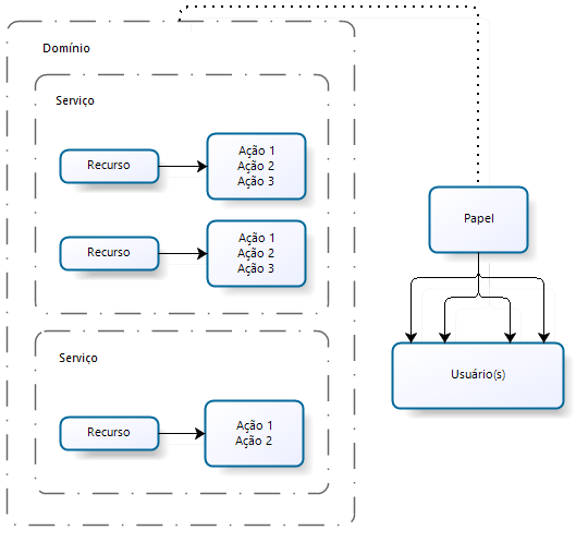 - Servicio: es el segundo nivel de permisos, compuesto por los elementos que implementan un conjunto de funcionalidades de un dominio. Por ejemplo: "flujo de caja" como responsable de la entrada y salida de recursos financieros de una empresa;