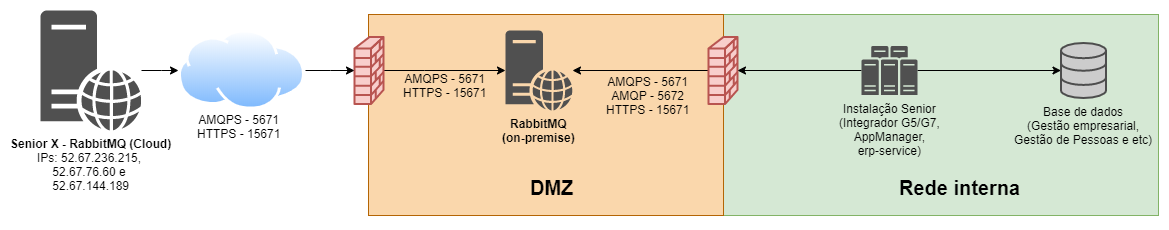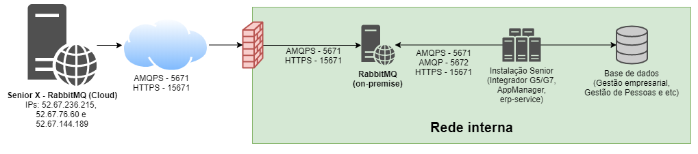 - La regla principal es que solo las IP senior (52.67.236.215, 52.67.76.60 y 52.67.144.189) tienen acceso externo a los puertos AMQPS (5671) y HTTPS (15671) de RabbitMQ On-Premise. Esta restricción debe aplicarse en el firewall que recibe conexiones externas (Internet).